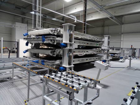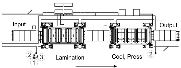 The photo shows the entire line. Modules enter from the left and are arranged on the input conveyor table. From there they are moved into either the lower or upper laminator. On the right side of the photo in the background is the cooling press. Pressing takes less time than a typical lamination cycle and therefore one press serves both laminators. The line is fully automated.