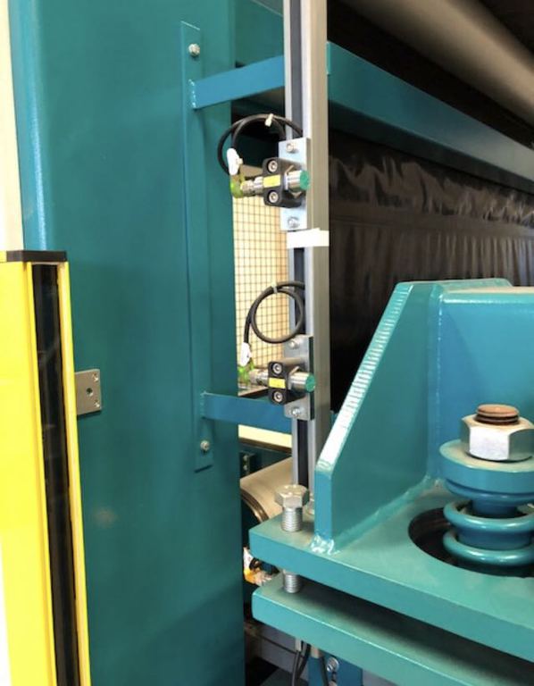 The laminator is shown here from its output end. Safety fences and a light curtain protect operators.