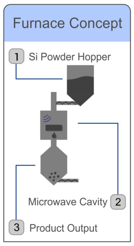 Silicon powder/fines are loaded into the hopper. From there they are transported continuously into the microwave cavity. Following gravity, the melted silicon passes a filter and is then directed to solidify in the output unit. The size of the solidified pieces can be adjusted from pellets to chunks.